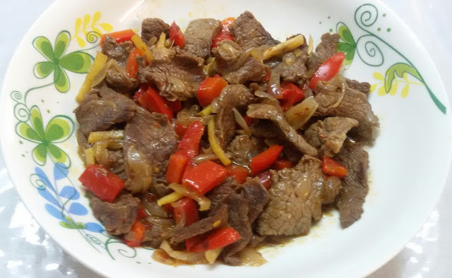 Panaskan kuali tanpa minyak. Goreng daging dalam 10 minit hingga airnya kering. Kemudian barulah masukkan minyak dan juga bawang-bawang dan halia yang telah dihiris. Terus goreng daging sehingga bawang dan halia wangi dan layu. Masukkan pula cili benggala merah, sedikit air, garam dan baki sos tiram. Jangan goreng terlalu lama supaya cili benggala tidak menjadi terlalu lembik. Balik-balikkan berapa minit dan hidang.